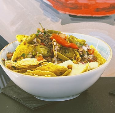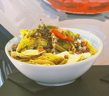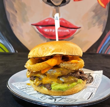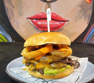 Queso Cheddar, Mermelada de Bacon, Aros de Cebolla, Guacamole y Mayo picante.