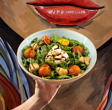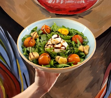Rúcula, Tomates Confitados, Croutons, Aderezo de Pesto y Burrata.