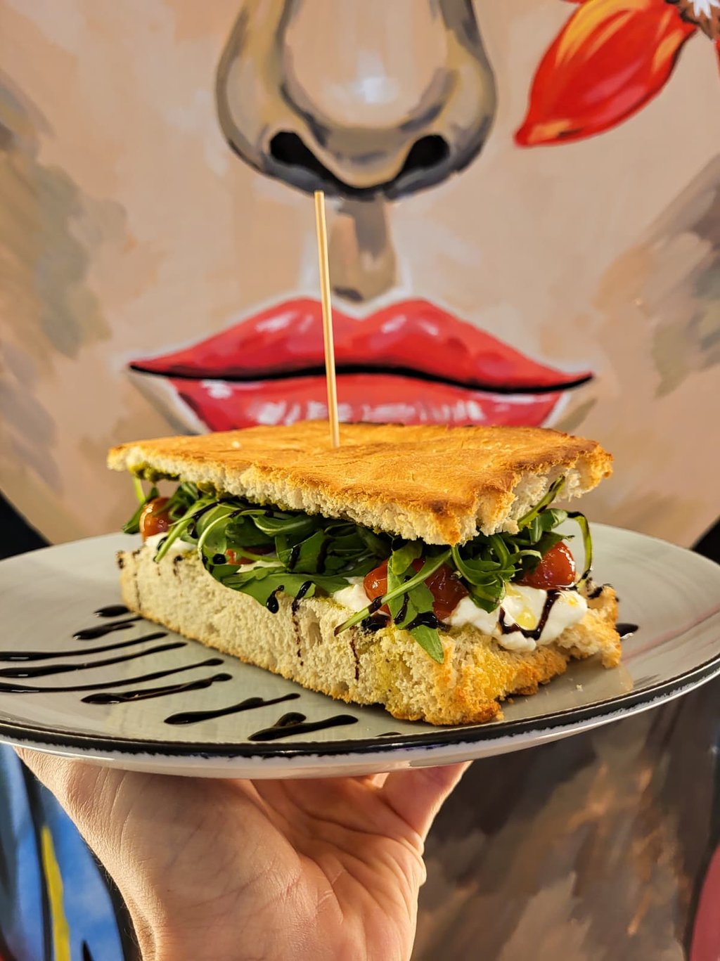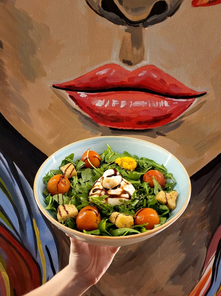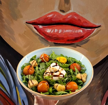 Rúcula, Tomates Confitados, Croutons, Aderezo de Pesto y Burrata.