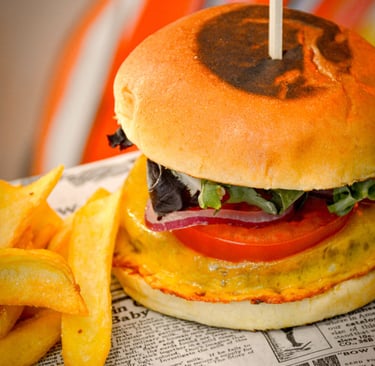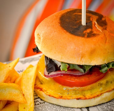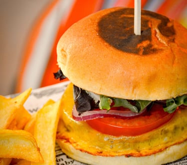 Queso Cheddar, Tomate, Lechuga, Cebolla Morada, Mayonesa.