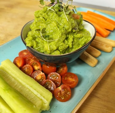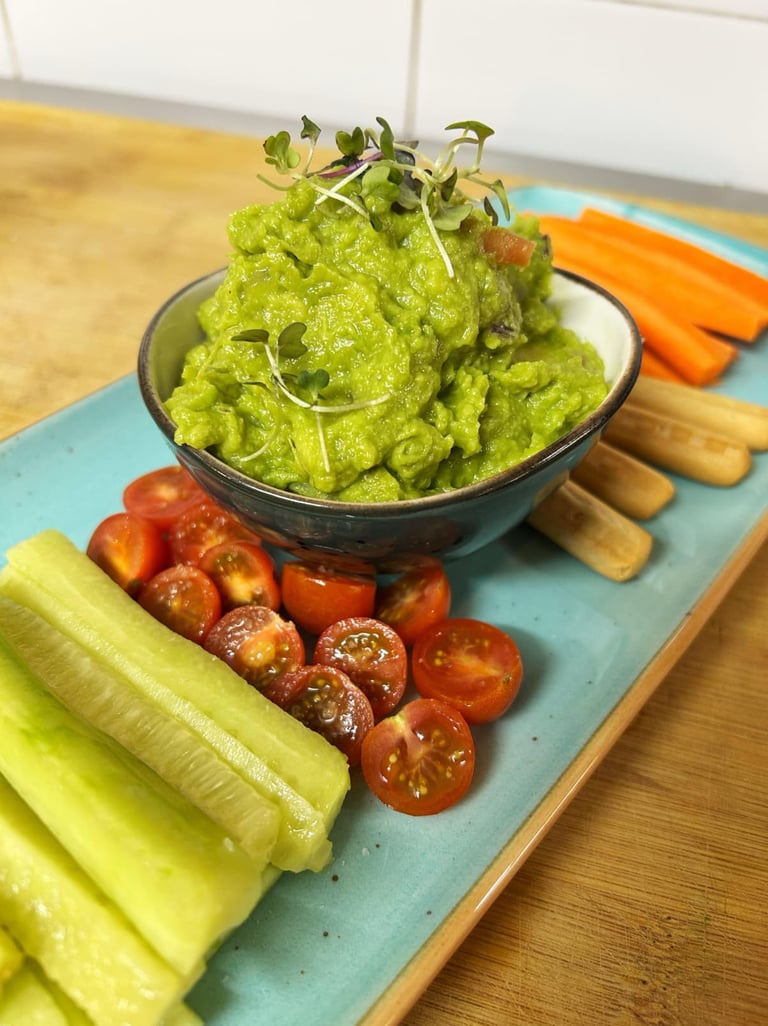 Dip de guacamole casero, zanahoria, cherrys y pepino.